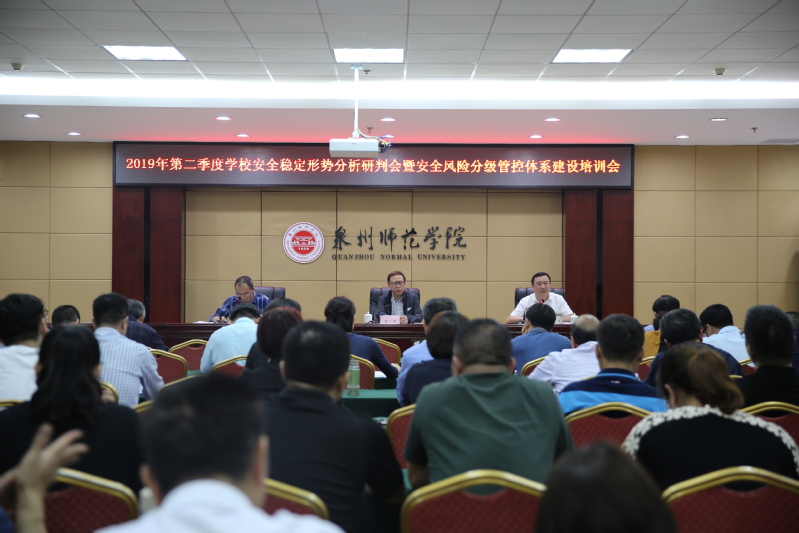 4月22日下午,我校召开2019年第二季度学校安全稳定形势分析研判会暨安全风险分级管控体系建设培训会。校领导屈广清、林伟,机关各部门负责人,各二级学院党政、学工办负责人和各单位安全风险评估联络员参加了会议。会议由校党委副书记林伟主持。