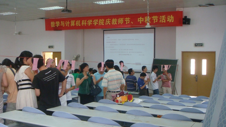 | 数计学院于9月8日下午在理工楼419举行庆祝教师节、中秋节活动,本次活动设有博饼、猜谜等项内容。活动前学院领导、工会进行多次探讨和做了充分的准备工作。除了在外代职及病假的老师,全院的其余老师均参加此次活动。 博饼活动设有4个奖项:一等奖1个、二等奖5个、三等奖20个、优秀奖43个,参照通常的博饼规则,参加活动的老师以投掷6个骰子出现“4点”的个数作为成绩。活动进行了三个程序:第一次全体老师根据专业分为三组,每位老师可投掷三次骰子确定了前三个奖项人选;第二次入围的老师每人投掷一次骰子,随后确定了前两个奖项人选;第三次从剩下的6位老师中最后确定一、二等奖的名单。在活动的现场,老师们双手捧着骰子,“6个四”、“5个四”等呼声此起彼伏.同时进行的猜谜活动设有80条谜语,限定每位老师限最多只能猜中3条,在此活动区域,一切显得安静多了,老师们望着谜语在聚精会神的思索着,沉默之后就是爆发,充分体现了数计人善于思考,善于开拓. 这次庆祝活动场面热烈,教师们的欢笑声跌宕起伏,展现了节日欢庆、和谐、积极奋进的气氛。 | |