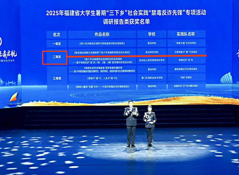 11月18日至21日,由福建省禁毒委员会办公室、福建省教育厅、福建省司法厅和共青团福建省委员会联合主办的全省高校禁毒志愿宣讲培训班暨首届大学生禁毒文化艺术节在福建理工大学、福州大学城艺术文化中心隆重举办。 活动期间,公布了2025年福建省大学生暑期“三下乡”社会实践“禁毒反诈先锋”专项活动结果,我院化工科技创新创业协会组建的守望青春不“毒”行实践队凭借扎实的实践成果与新颖的宣传形式脱颖而出,创作的视频作品《破毒一一“药”命的电子烟》荣获一等奖,撰写的调研报告《新型毒品隐蔽化传播背景下青少年禁毒教育路径优化研究》斩获二等奖。
