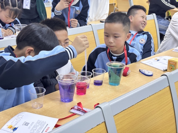 趣味化学小实验环节,志愿者们现场准备了可乐遇上牛奶、盐水牛奶烟花、紫甘蓝变色三个趣味小实验。宣讲志愿者用通俗易懂的语言讲解科学原理、统一演示操作步骤,带领孩子们分组动手操作,全程严控实验规范。孩子们在探索中见证可乐与牛奶的沉淀反应,树立健康饮食观念;邂逅盐水牛奶里的五彩“烟花”,感受化学的美丽与奥秘;探寻紫甘蓝水的变色魔法,让化学知识与生活食材搭建起趣味联结。此次活动旨在寓教于乐中引导孩子们正确认识化学、善用化学知识,自觉远离毒品及危险化学品。