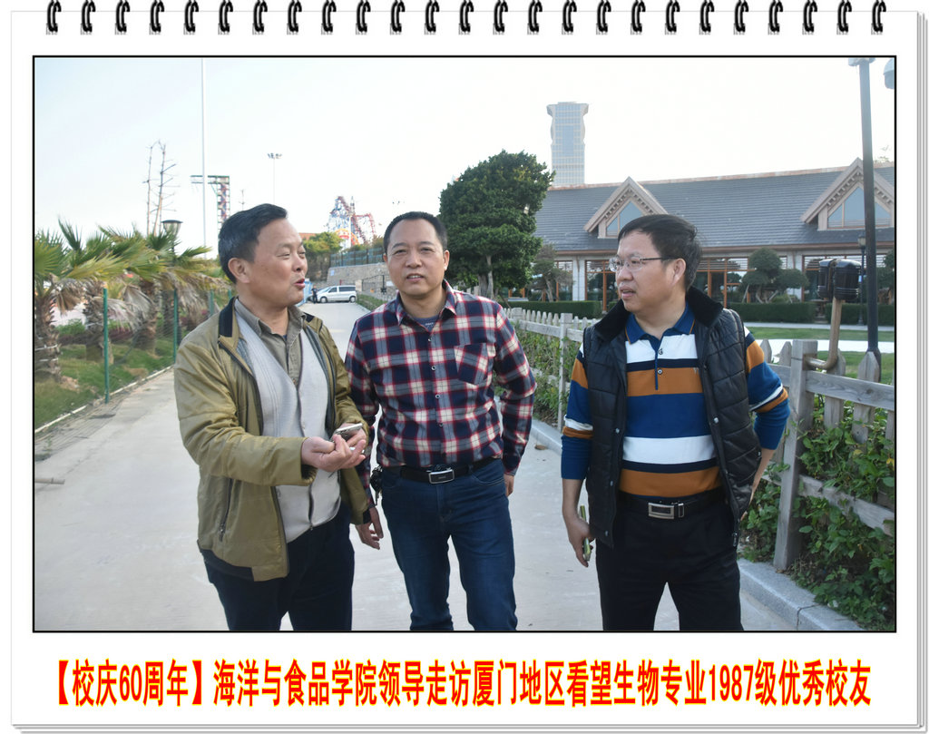 2018年3月31日,海洋与食品学院院长袁建军教授、书记蔡英卿教授与学校科研处处长戴聪杰教授赴厦门市走访看望生物专业1987级优秀校友、厦门市教育事务受理中心主任蒋思彬、厦门湖里区金尚中学叶琳、同安区洪塘中学庄建成、翔安区刘五店中学陈国民。袁建军一行与校友进行了热烈的交流和对接,并希望在60周年校庆即将到来之际,搭建好校友与母校畅通的交流合作渠道。