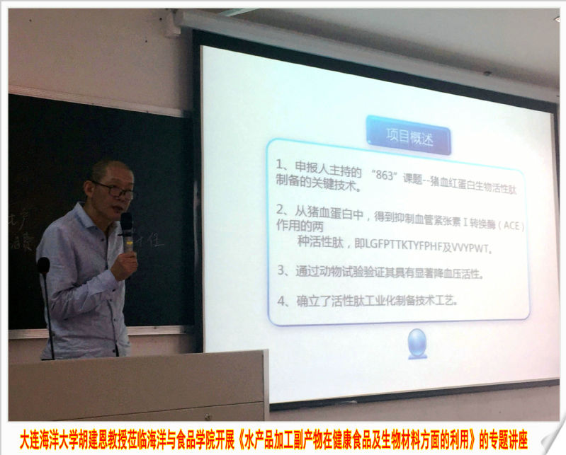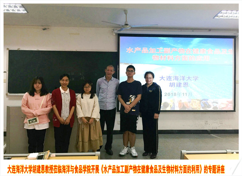 2018年12月4日,大连海洋大学胡建恩教授在荣茂楼301教室,为海洋与食品学院2018级生物技术和海洋技术专业学生开展了《水产品加工副产物在健康食品及生物材料方面的利用》的专题讲座。