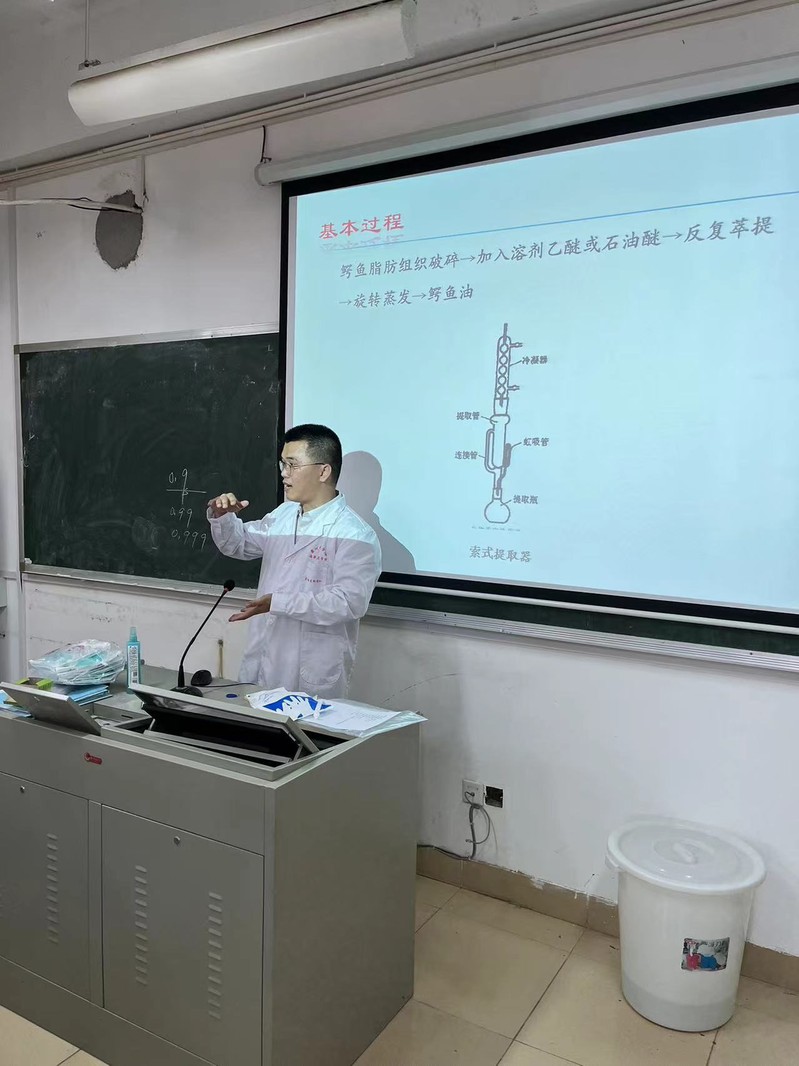 下午,李华亮副教授在宝龙实验楼2-601为该专业学生开展题为《鳄鱼油的制备及工艺》的实验课教学工作。在实验课的教学过程中,李华亮副教授指导学生仪器设备的操作,并时刻提醒学生注意安全,使学生的实验技能得到了巩固和提高。