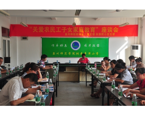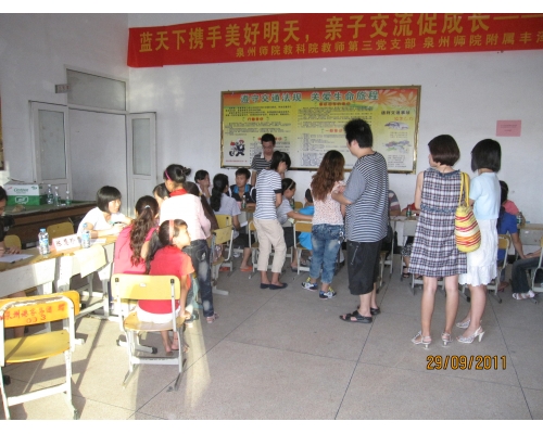 日前,教育科学学院教师第三党支部党员教师在泉州师院附属丰泽小学召开以“蓝天下携手美好明天,亲子交流促成长——关爱农民工子女心理成长”为主题的支部立项活动。该活动是许松芽教师负责的泉州师范学院2011年党支部重点扶持项目的其中一个活动,活动的目的在于关心农民工子女的家庭教育,推动泉州师院教师第三党支部和泉州师院附属丰泽小学党支部交流合作,提高泉州师院应用心理学专业大学生的专业素质。