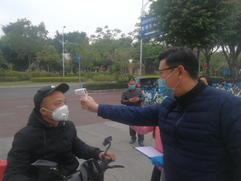 学员郁朝善在丰泽区环清社区交通检疫处为出入人员检测体温