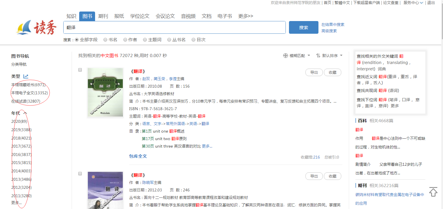 (2)进入搜索结果页面,点击页面左端的“本馆馆藏纸书”“本馆电子全文”“在线试读”,以及不同年代,可以限定搜索结果的范围。其中,“本馆馆藏纸书”表示本馆均有纸质藏书;“本馆电子全文”表示可以在线阅览全文;“在线试读”包括可以在线阅览全文及可以在线试读两种。