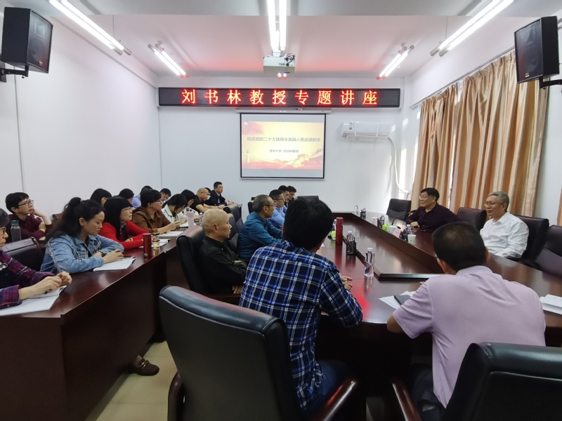 为深入学习宣传贯彻党的二十大精神,深入开展学习贯彻习近平新时代中国特色社会主义思想主题教育,不断推进 “深学争优、敢为争先、实干争效”行动,近日,马克思主义学院举办主题教育专题讲座,邀请清华大学马克思主义学院刘书林教授作题为《推进党的二十大精神全面融入思政课教学》专题辅导讲座。学院党政领导、党支部书记、教研部主任和教师代表参加会议。