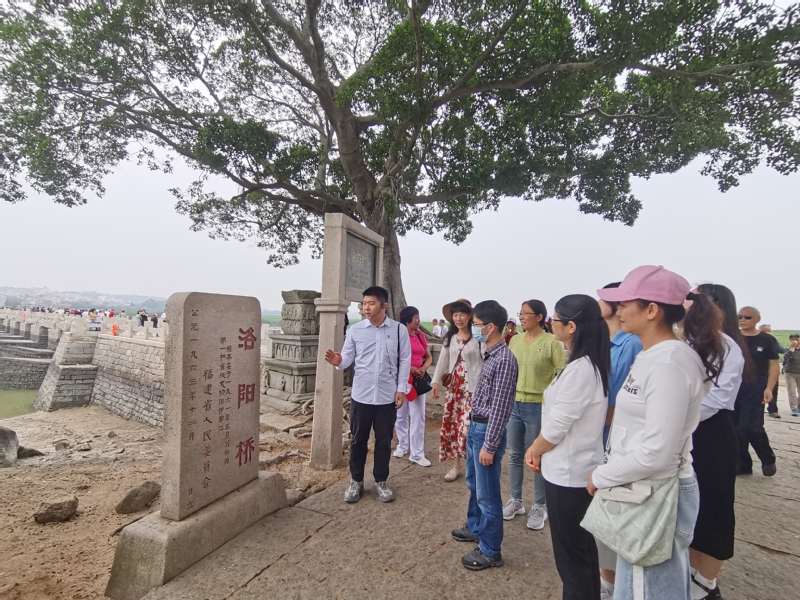 研学的第一站来到洛阳桥,洛阳桥又称“万安桥”,位于洛阳江水道之上,也是著名的跨海梁式大石桥,素有“海内第一桥”之誉,是古代“四大名桥”之一。来自泉州师范学院、泉州轻工职业学院、泉州海洋职业学院、泉州信息工程学院、福建电力职业技术学院的宣讲团成员踏上这座历经千年风雨的古桥,倾听它与海上丝绸之路的传奇故事,感受宋元时期泉州海洋交通设施发达、海洋贸易活动繁盛历史见证的点点滴滴。