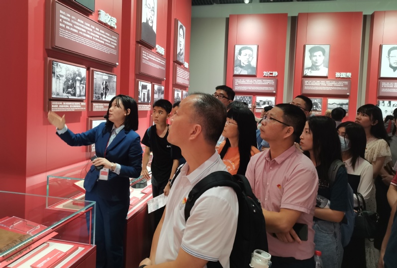 参训教师跟随讲解员赴中共一大会址学习,集体参观了“伟大的开端——中国共产党创建历史”陈列展。展厅由序厅、“前仆后继、救亡图存”“民众觉醒、主义抉择”“早期组织、星火初燃”“开天辟地、日出东方”“砥砺前行、光辉历程”及尾厅组成。陈列内容紧扣“初心使命”,并以此贯穿始终,综合运用多种展示手段全面系统展示中国共产党的诞生历程。