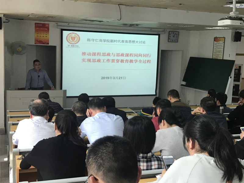 为贯彻落实全国教育大会和新时代全国高等学校本科教育工作会议精神,学习贯彻习近平总书记在学校思想政治理论课教师座谈会上重要讲话,进一步提升陈守仁商学院思政工作水平,2019年3月21日,学院举办新时代教育思想大讨论“院长论坛”,许旭红副院长为全院教职工作题为《推动课程思政与思政课程同向同行 实现思政工作贯穿教育教学全过程》的专题报告。许副院长紧扣“高校培养什么人、如何培养人以及为谁培养人”这一根本问题,从新时代高校育人要求和高校思政工作现状谈起,阐述课程思政与思政课程的关系,指出两者在育人过程中,思政课程是主渠道,课程思政起辅助促进作用,因此各门课要“守好一段渠、种好责任田”,充分挖掘课程自身的思政教育资源,将思政教育融入课程教学各环节各方面,润物无声地实现立德树人目标。许副院长指出,课程思政与思政课程同向同行问题,是认识与实践的统一性问题。课程思政方向要向思政课程靠拢,在政治上、信仰上、核心价值观上保持一致,才能达到知行合一,形成协同育人效应。最后,许副院长根据学院课程思政的具体情况,要求学院教师要真正“回归本分”,多学多思多悟多行,打牢自身思想政治素养,尽快提炼核心课程,用好已有重要渠道,扎实开展教研共享,实现思政工作贯穿教育教学全过程,努力培养德智体美劳全面发展的社会主义建设者和接班人。