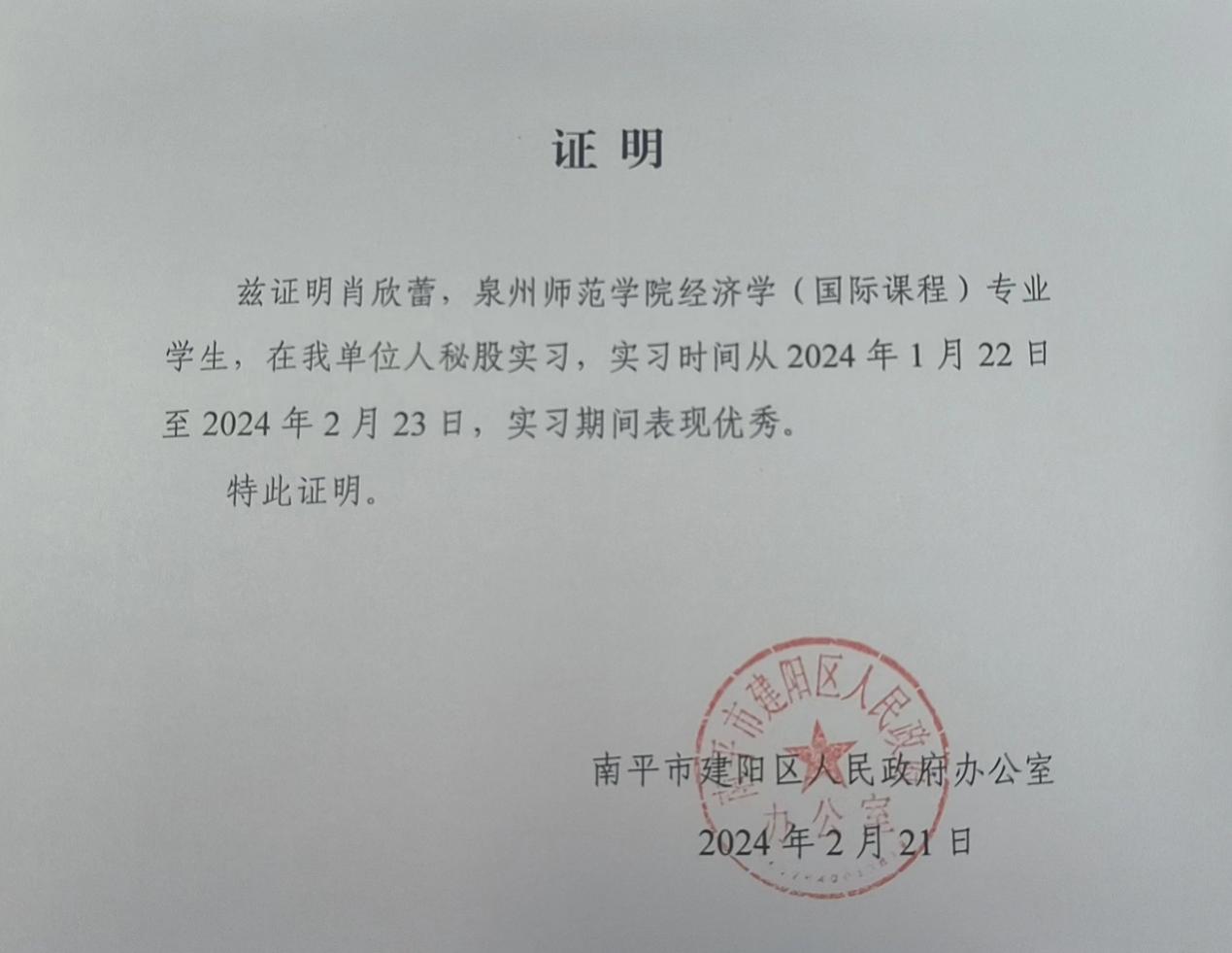 肖欣蕾,陈守仁商学院2022级经济学(国际课程)专业学生。她参加福建省大学生实习“返家乡”活动,担任南平市建阳区人民政府办公室实习生。在实习期间,她对政务工作有了更加深入的了解和认识,也对自己有了更清晰的定位。通过这次实习,她更加勤于思考,勤于实践,善于沟通协调。