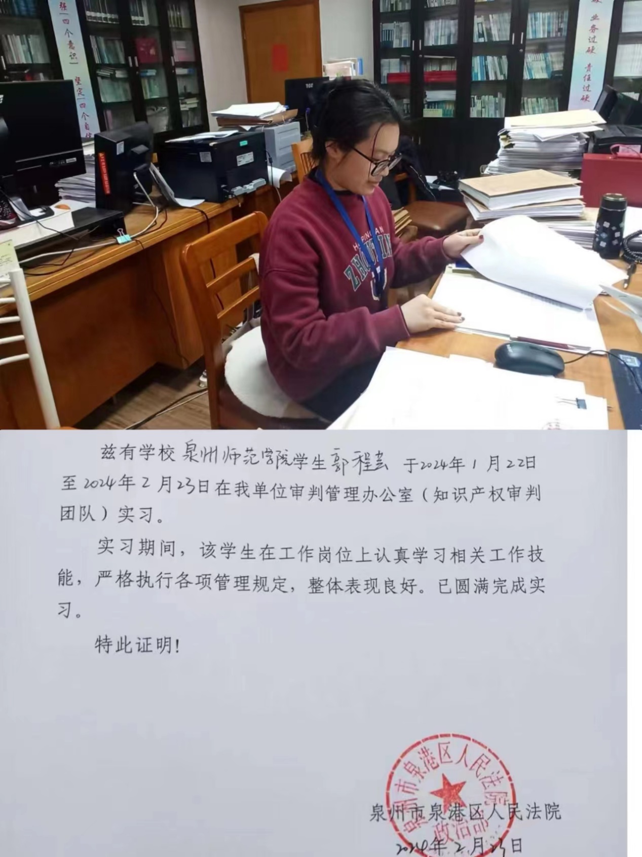 郭程芸,陈守仁商学院2022级知识产权专业学生。她参与福建省大学生实习“扬帆计划”活动,担任泉州市泉港区人民法院审判管理办公室实习生。在实习期间,负责检查民事裁定书等法律文书,整理装订卷宗。通过本次实习实践,她感受到法院工作氛围,将法律知识履行在实践之中,更加深刻坚定了自己的法律梦想。