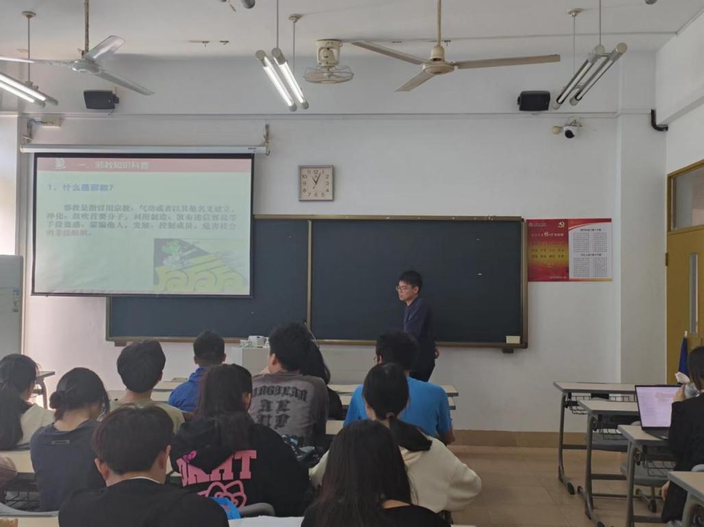 班会上,辅导员围绕邪教的性质、特点及危害等内容,通过图片、视频、文字等形式向同学们揭露邪教反人类、反社会、反科学的本质,让同学们充分了解“如何快速识别邪教”以及遇到邪教的正确做法。同时,辅导员还引导学生远离邪教、崇尚科学,筑牢思想防线,增强法制观念,树立正确的世界观、人生观和价值观,自觉抵制邪教的侵蚀。