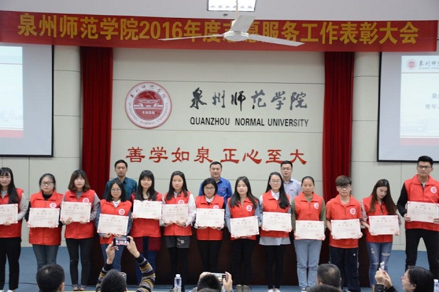 首先,校团委副书记刘显新宣读《2016年度泉州师范学院青年志愿者服务先进集体、优秀组织者、优秀青年志愿者表彰决定》,肯定志愿者的努力,鼓励志愿者团队再接再厉,发挥优秀志愿者的模范带头作用。 接着进入颁奖环节流程,主席台上领导老师为在“善行100·温暖活动”中表现突出的志愿者以及我校2016年度先进集体、先进个人颁发证书并合影留恋。这是每一位志愿者的荣耀,更是一份责任,激励志愿者在奉献的道路上不断前行。