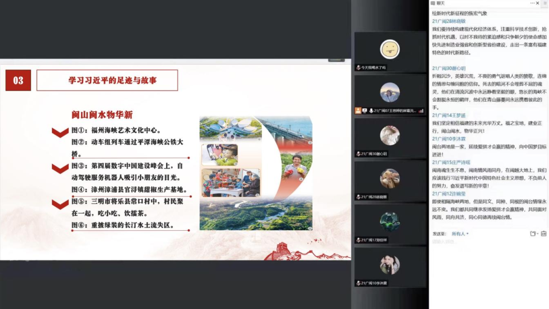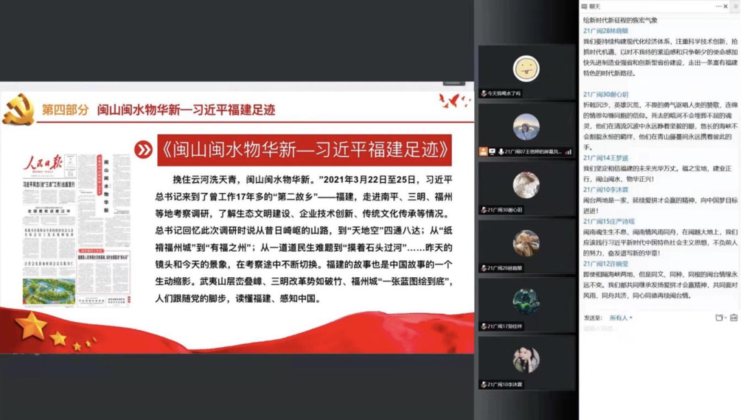 充分发挥基层团委和团支部的组织优势,实现基层组织学习全覆盖,组织全校445个基层团支部开展云上主题团课,以《闽山闽水物华新——习近平福建足迹》为鲜活读本,广泛号召青年学生结合习近平总书记在福建工作探索实践的点点滴滴,谈认识、谈体会、谈践行,真正带着感情学、带着使命学、带着责任学,进一步汇聚起砥砺奋进新时代的不竭动力。