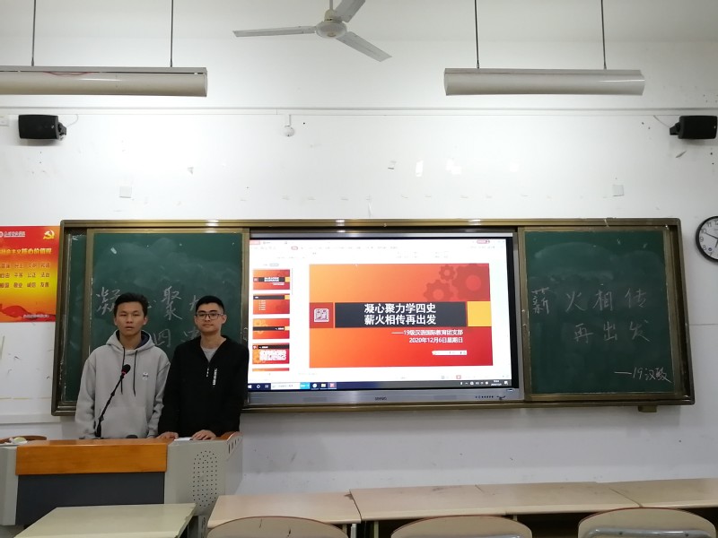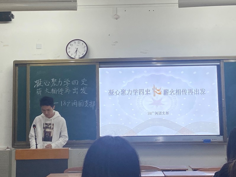 各班紧扣主题,开展了形式新颖、内容丰富、富有教育意义的主题团日活动。18广闽通过介绍四史的具体内涵,讲述四史中的重要进程,引导同学们进行思考,从而触发为国自豪的情怀;19汉教通过知识竞答的方式与同学们积极互动,加深同学们对四史的理解和认识;20中文1班集体朗诵散文《可爱的中国》,使同学们深刻领会到革命党人的坚强意志和顽强不屈的精神。
