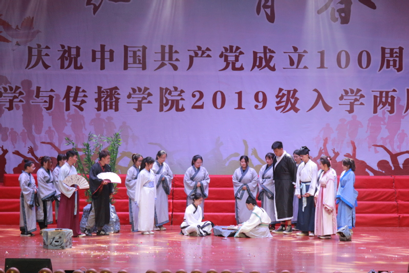 经过19级各专业的精心组织和筹备,晚会为现场观众呈现出一场视听盛宴。首先19级广电以古典舞《苏幕遮》一展古诗词之美;《稻香》、《最美的太阳》和《一个像夏天一个像秋天》的歌曲串烧,让观众感受同学们的青春风采。随后19级广闽以舞台剧《不做总统的广告人》,带领我们走进广告人的内心世界。19级汉教用古风舞蹈《书简》开场,现古典雅色;多国语言合唱的歌曲《夜空中最亮的星》,展现文化交融之魅力。19级书法改编情景剧《兰亭修楔》,曲水流觞,纶巾张扬,风流典雅;走秀《乘风破浪》优雅灵动,带来魏晋风骨与现代服饰的绝妙碰撞。19级中文1班《诗经》情景剧跨越千年,古韵优雅,《烟雨舟行》一舞惊鸿;一曲《关山酒》,年少轻狂,舞剑尽风流;一首《但愿人长久》,满怀诗情画意。19级历史《五四运动》舞台剧的表演,重现百年前的青年民族气节,传承五四红色火炬。19级中文2班朗诵《我深深爱恋的祖国》彰显当代青年的爱国情怀。在晚会现场,还面向全体观众进行党史知识抢答活动,经过三轮紧张激烈的抢答,共有20名同学答对问题获得奖励。最后,晚会在《仰望星空》大合唱中落下帷幕。