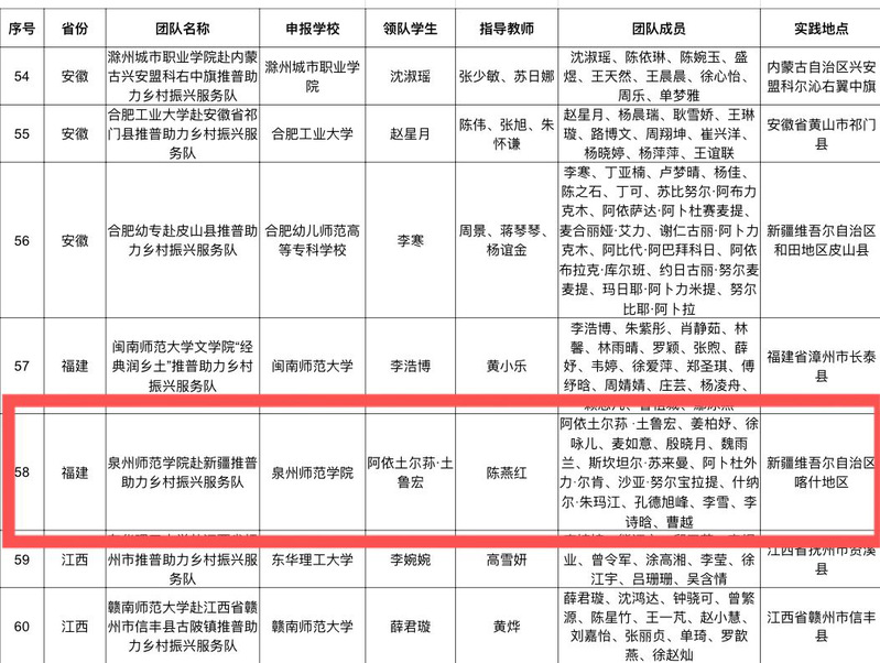 2023年2月,教育部发布《2022年“推普助力乡村振兴”全国大中专学生暑期社会实践志愿服务活动中经遴选优秀的团队名单》,由泉州师范学院国家语言文字推广基地、泉州师范学院文学与传播学院团委组织的“赴新疆推普,助乡村振兴”团队成功入选。