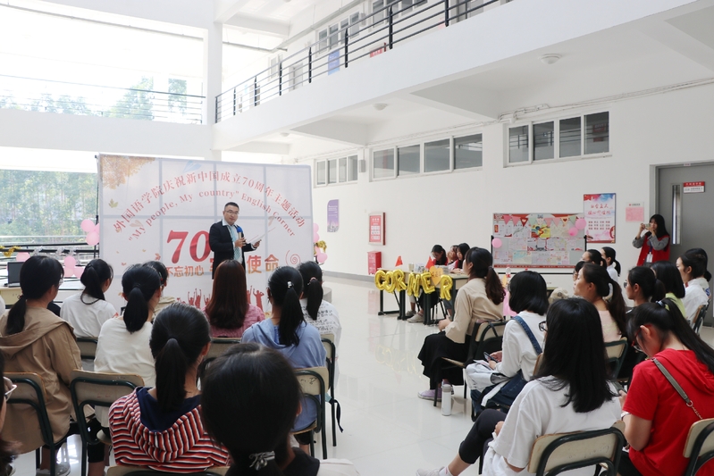10月24日下午两点半,迎来了外国语学院庆祝新中国成立70周年的主题活动——英语角。此次活动由吴景森老师主持,特邀Mr.Russia和刘巧艺老师,我院多名同学们出席并参加此次活动。