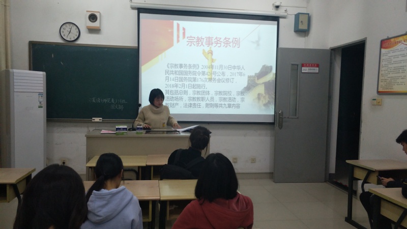 为深入贯彻党的民族宗教政策学习教育活动的精神,保证我校办学方向,帮助同学们树立正确的意识,维护学校正常的教育教学秩序,12月22日晚上7许,在各班班委的精心组织和指导下,利用散学集合时间,组织外国语学院全体学生在教室举办了以“关于宗教事务条例”为主题的班会。通过本次主题班会,进一步加强了学院的管理,完善了各类规章制度,把学校办成健康向上,追求真理,学习科学的园地,增强全体师生抵御唯心主义和宗教思想的能力。