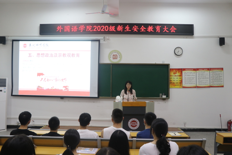 为加强新生的安全文明意识,培养新生树立正确的人生观、世界观、价值观,深入了解军训的相关事宜,外国语学院于9月20日晚六时许,在外文楼112召开了新生安全教育、宗教观教育及军训动员大会。本次大会2020级新生辅导员黄婧老师主持,我院党委书记蒋双霖老师出席本次大会,全体2020级新生到场参加。