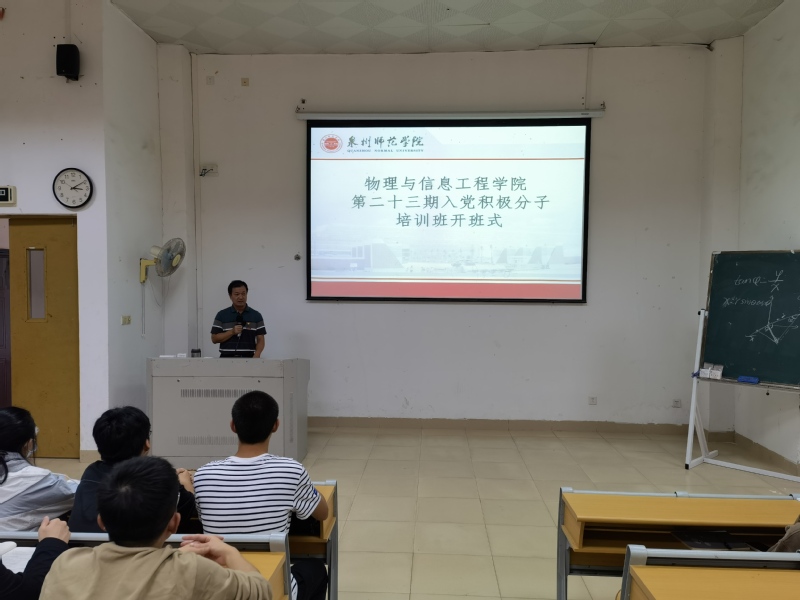 为进一步做好党员发展工作,加强对入党积极分子的教育和培养,2021年10月21日下午,物理与信息工程学院在理工218教室举办第23期入党积极分子培训班开班式,院党委副书记、纪委书记洪荣文,各学生党支部书记,第23期入党积极分子参加,开班式由邱若滢老师主持。