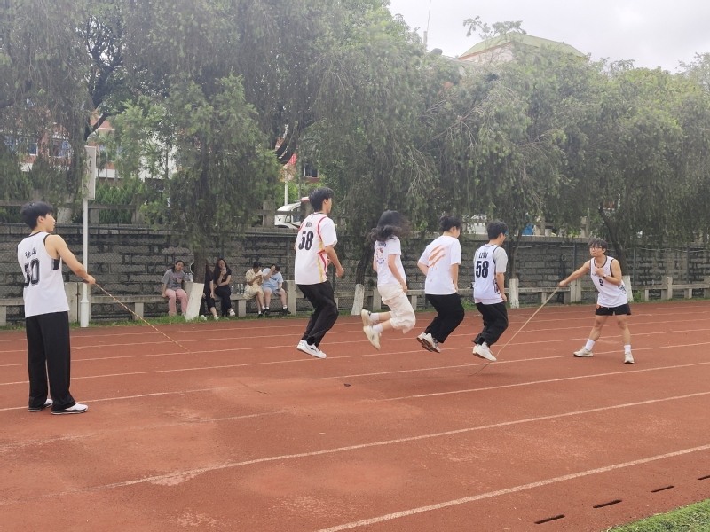 跳长绳项目中,6名队员齐心协力,在摇绳间不断刷新跳绳次数。