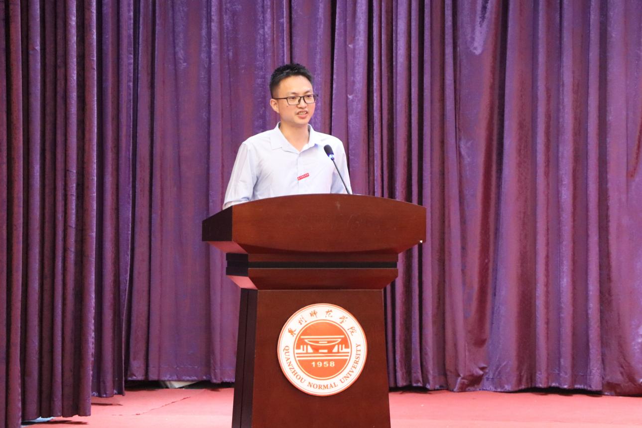 新教师代表徐霖强博士分享科研心得,寄语新生保持好奇、追求卓越,勇于探索未知,保持好奇与热情,在这片科学的沃土上共同耕耘、共同成长。
