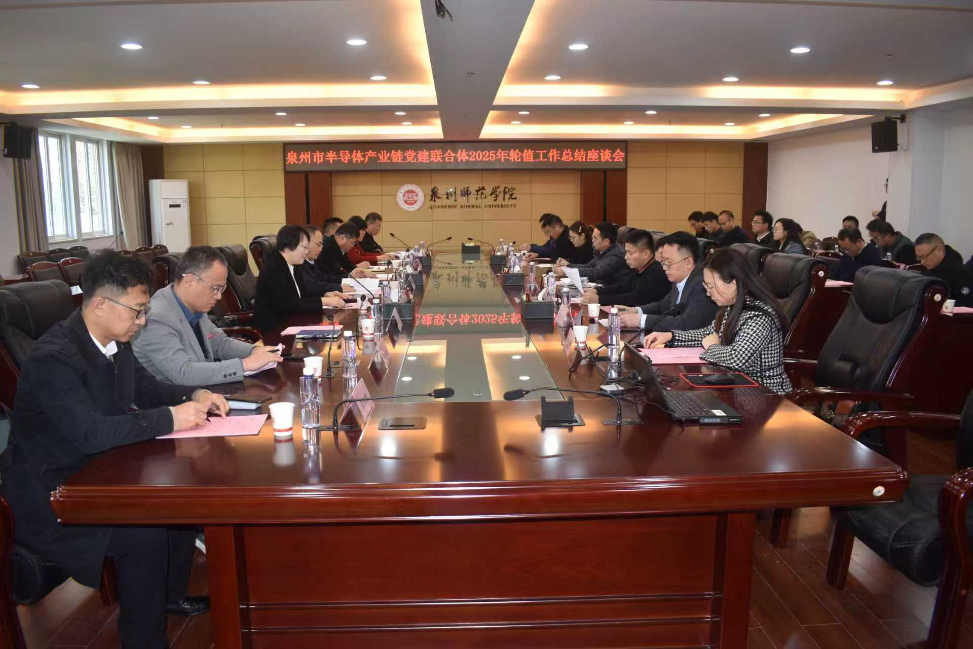 2026年2月3日上午,泉州市半导体产业链党建联合体2025年轮值工作总结座谈会在泉州师范学院召开。会议总结回顾过去一年轮值工作成效,谋划部署新一年任务,并顺利完成轮值主席单位交接。