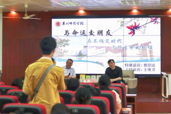 主题分享会在俊秀图书馆学术报告厅举行。文学与传播学院院长与蔡崇达以“与命运交朋友:在不确定时代寻找生命的韧性”为主题进行对话交流。蔡崇达向老师同学们分享了求学泉州师范学院前后的故事:原定保送北京师范大学名额却在高考前被通知取消;由理科生转为文科生参加高考;大学期间遭遇家庭变故,不得不利用学习之余兼职赚取学费……,生活充满不确定因素,但他始终初衷不改,按照自己的人生规划一步步向前,终于取得一个又一个成绩。