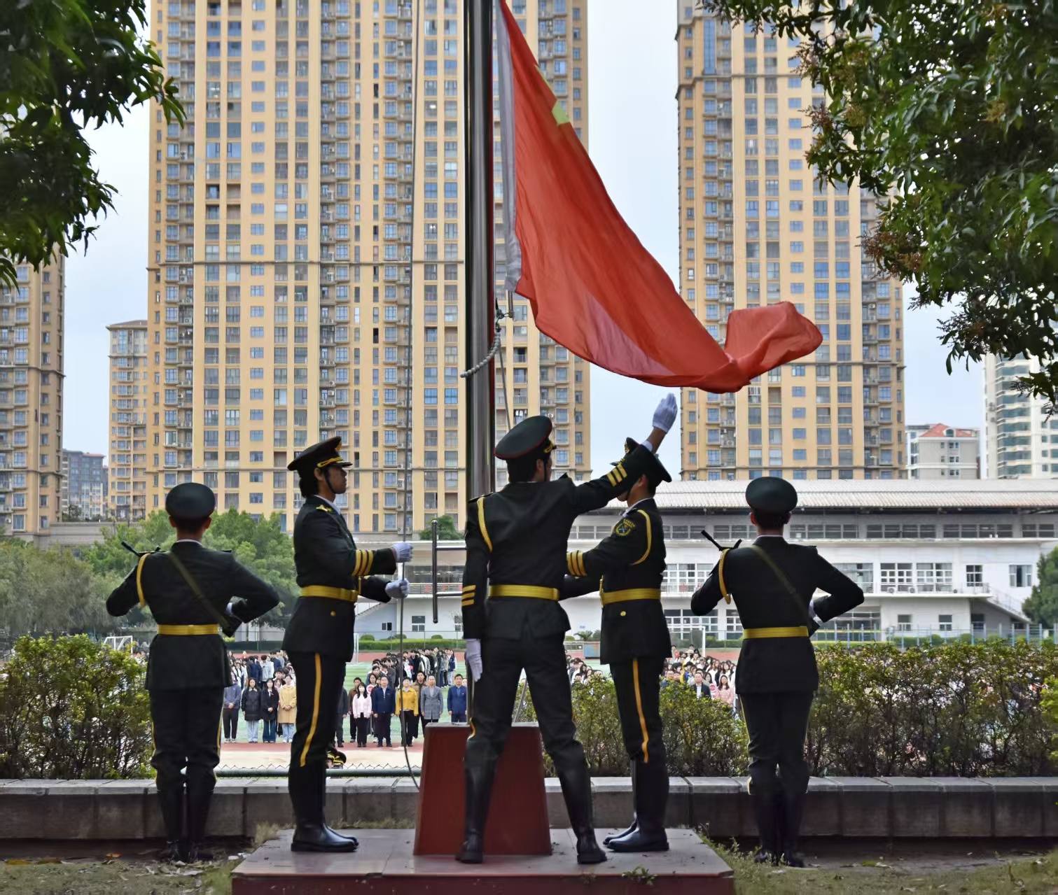 初春的晨光铺洒在田径场,薄雾在暖光中消散,空气里满是清新的朝气。6点50分,升国旗仪式正式开始。国旗仪仗队成员身着礼服,迈着整齐有力的步伐,踏着晨光走向升旗台,全场师生肃立注目,齐唱国歌,五星红旗伴随着雄壮的《义勇军进行曲》冉冉升起,在晨光中迎风飘扬。