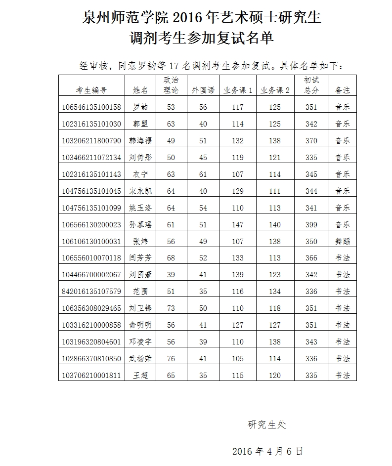 泉州师范学院2016年艺术硕士研究生 调剂考生参加复试名单