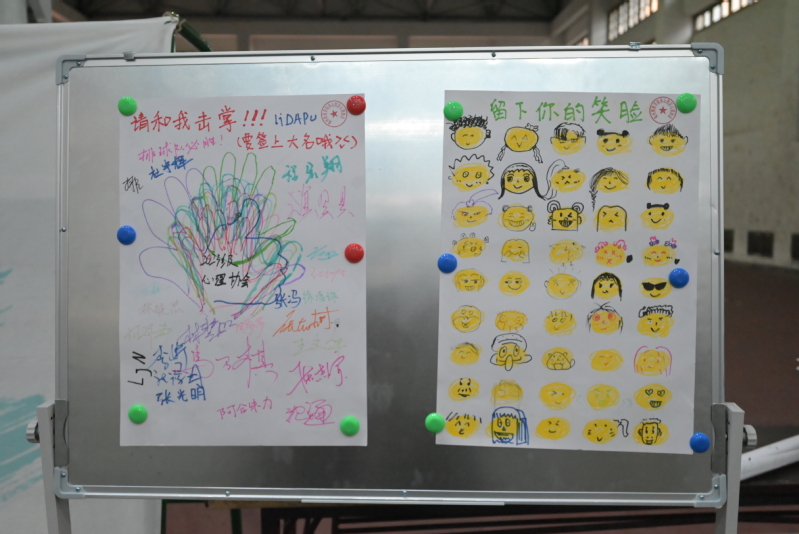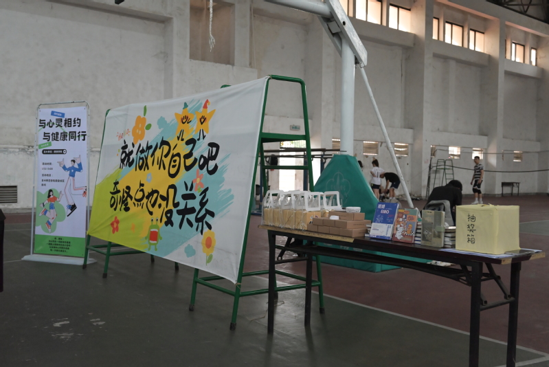 在体育馆的中心区域,两个色彩鲜明的展示板吸引了参与者的目光。展示板上活泼的图案吸引着同学们的目光:“就做你自己吧,奇怪点也没关系!”这搞怪有趣的标语既活跃了现场的氛围,又为同学们点明了此次活动的主题。