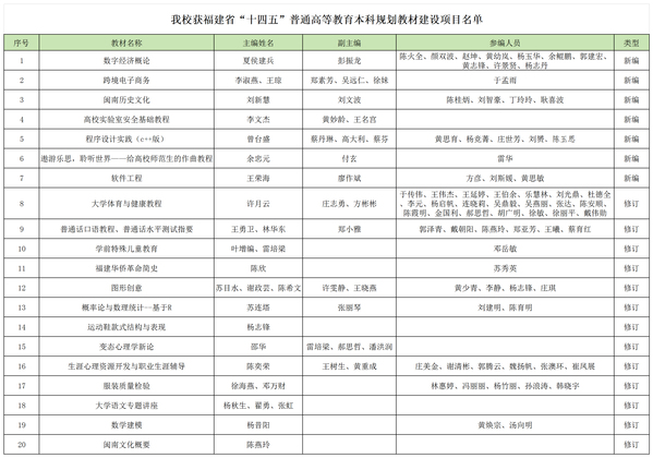 近日,福建省教育厅公布了福建省“十四五”普通高等教育本科规划教材建设项目名单,我校教师主编的20部教材入选福建省“十四五”普通高等教育本科规划教材建设项目,其中新编教材入选7部,修订教材入选13部,入选数位列同类高校首位。