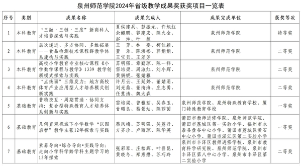 近日,福建省教育厅公布了2024年省级教学成果奖获奖项目,我校7项成果获奖。其中本科教育特等奖1项、二等奖3项,基础教育一等奖1项,另有2项参与完成的基础教育教学成果分别获得一等奖和二等奖。